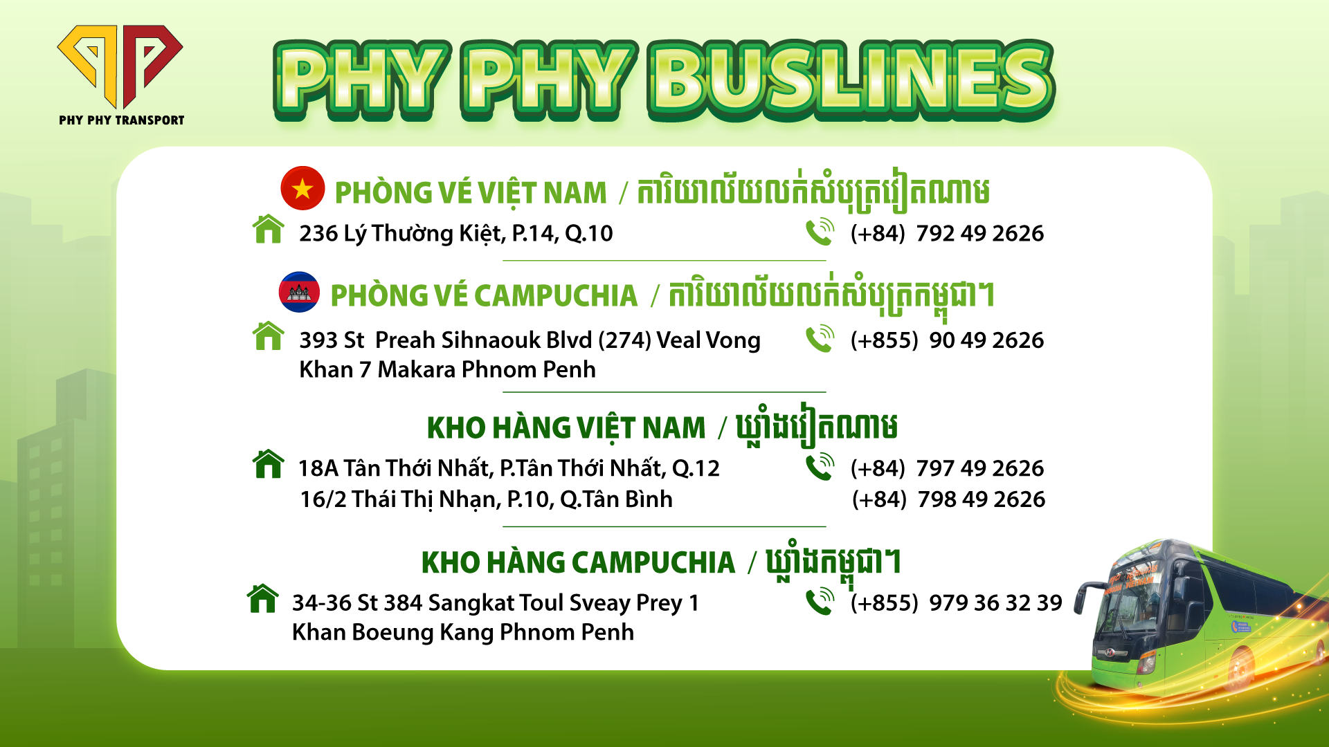 Đồng hành cùng quý khách trên mọi hành trình, PHY PHY TRANSPORT tự hào sở hữu hơn 8 năm kinh nghiệm trong việc cung cấp dịch vụ vận tải hành khách giữa Việt Nam và Campuchia, cam kết mang lại sự an tâm và tiện lợi tối đa.
